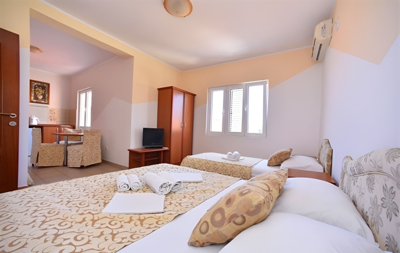 U ponudi su opremljeni studio apartmani različitog kapaciteta – dvokrevetni, trokrevetni i četvorokrevetni, prilagođeni kako parovima, tako i porodicama. Svaki apartman poseduje sopstvenu kuhinju, kupatilo i privatnu terasu, pružajući gostima potpunu udobnost i osećaj privatnosti tokom boravka.